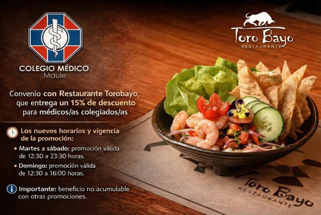 📣Informamos que se encuentra activo el convenio con Restaurante Torobayo, que entrega un 15% de descuento para médicos/as colegiados/as del Colegio Médico del Maule.