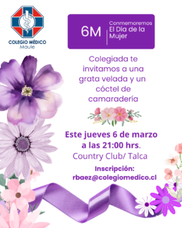 Colegiada este jueves 6 de marzo te invitamos a conmemorar el Día Internacional de la Mujer, con un momento de camaradería y rico cóctel, en Country Club (23 oriente 3201, 18 norte. Talca). Tendremos una hermosa vista, que nos permitirá disfrutar, conversar, y así crear un gran encuentro.