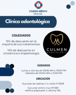Culmen odontología, es una clínica que ofrece cuidado dental integral y de calidad en un solo lugar. Atención en todas las especialidades, servicios radiológicos, pabellón de cirugía menor y la última tecnología existente. Nuestro convenio incluye un 15% de descuento en la mayoría de sus tratamientos y un 10% de descuento en ortodoncia e implantología. El beneficio cubre a colegiados y se extiende a su familia nuclear (hijos/as, cónyuge) como también a vuestros funcionarios.