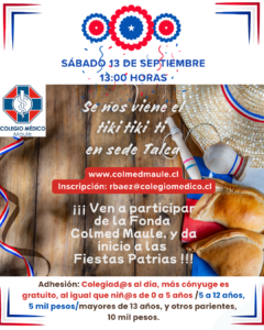 Colegiad@ ven a participar de la Fonda Colmed Maule 2025, en sede Talca🏡 (5 norte 1369, entre 6 y 7 oriente). Y da inicio a las Fiestas Patrias con todo. 🇨🇱🇨🇱🇨🇱🇨🇱